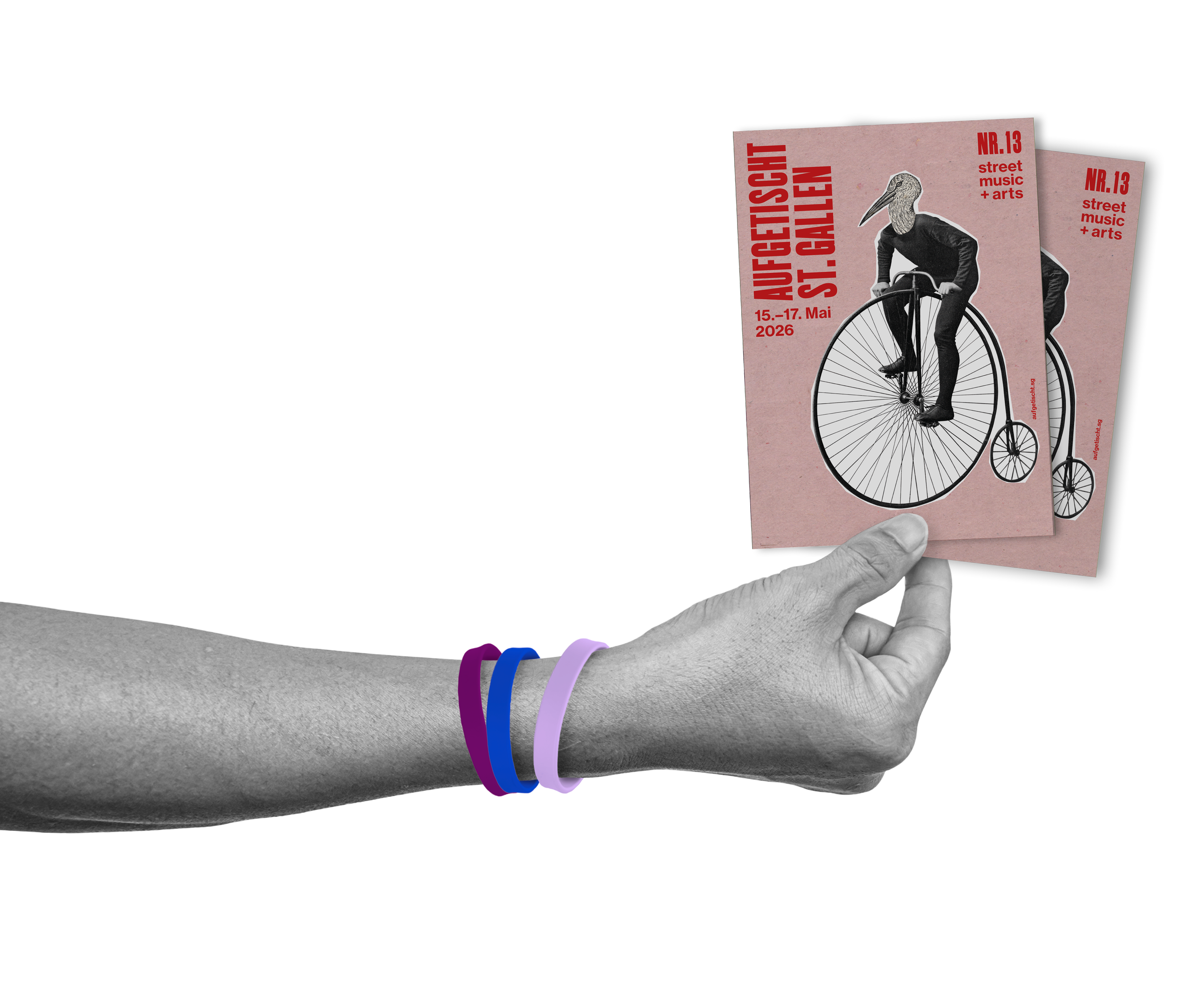 Aufgetischt St. Gallen ist auf deine Unterstützung angewiesen. Bitte kauf dir an den Infoständen oder bei den Verkaufsteams auf der Strasse ein Festivalarmband, damit wir dir auch in den nächsten Jahren ein spektakuläres Strassenkunstfestival bieten können. Gönner*innen und Erwachsene erhalten das Programmheft mit Spielplan und Infos zu den Künstler*innen dazu. Für Kinder gibts extra ein Kinderarmband – ohne Programmheft.